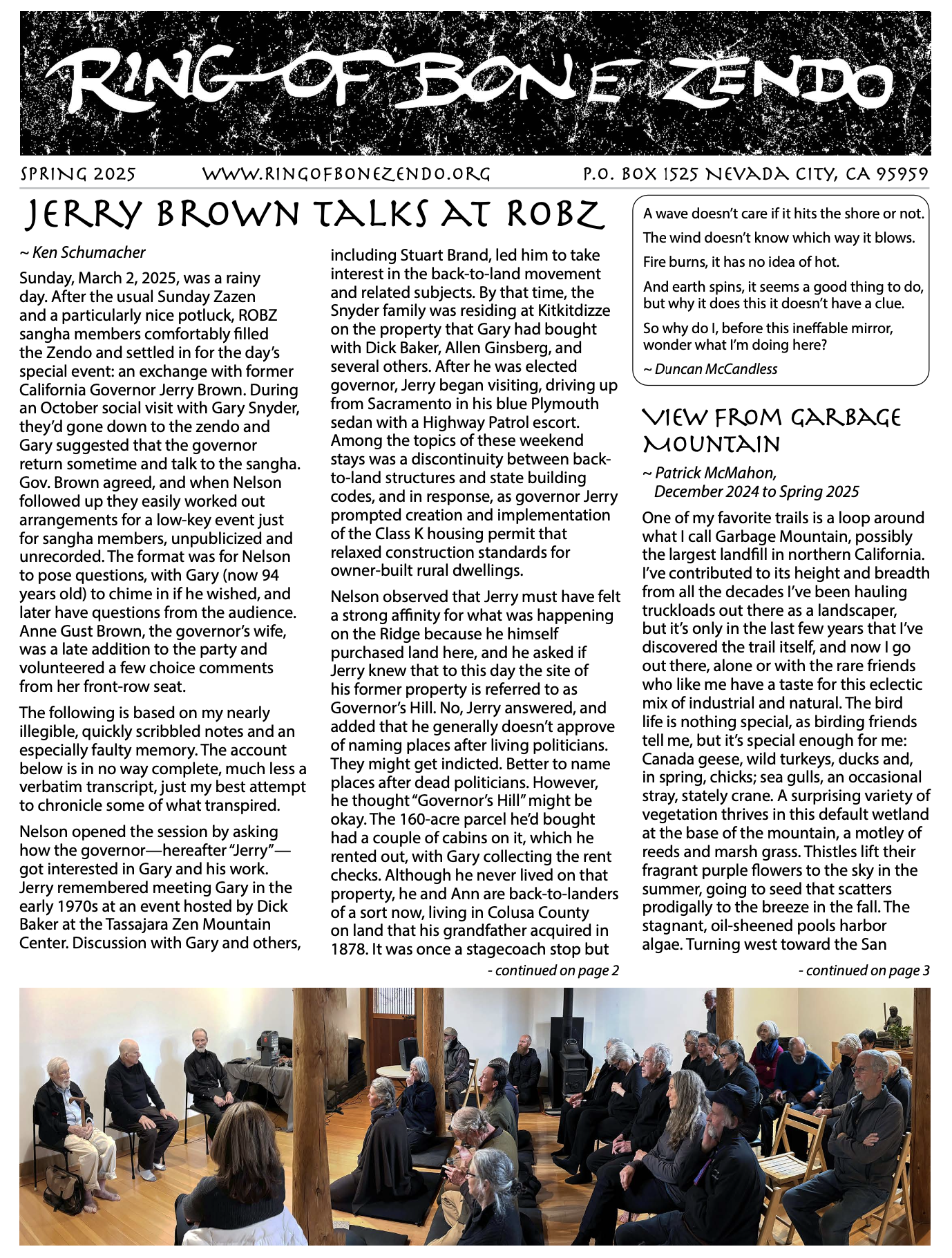 Ring of Bone Zendo has a long tradition of newsletters that mix the profound, the profane, and the literary. Our newsletters will certainly give you a sense of who we are, and how we practice.